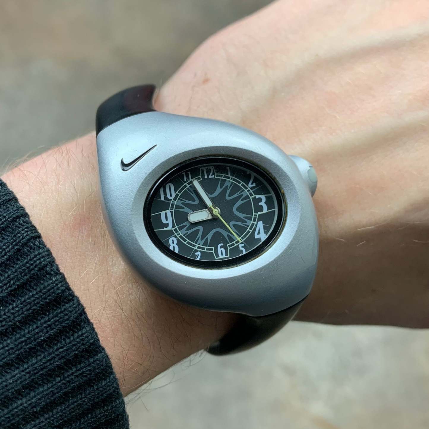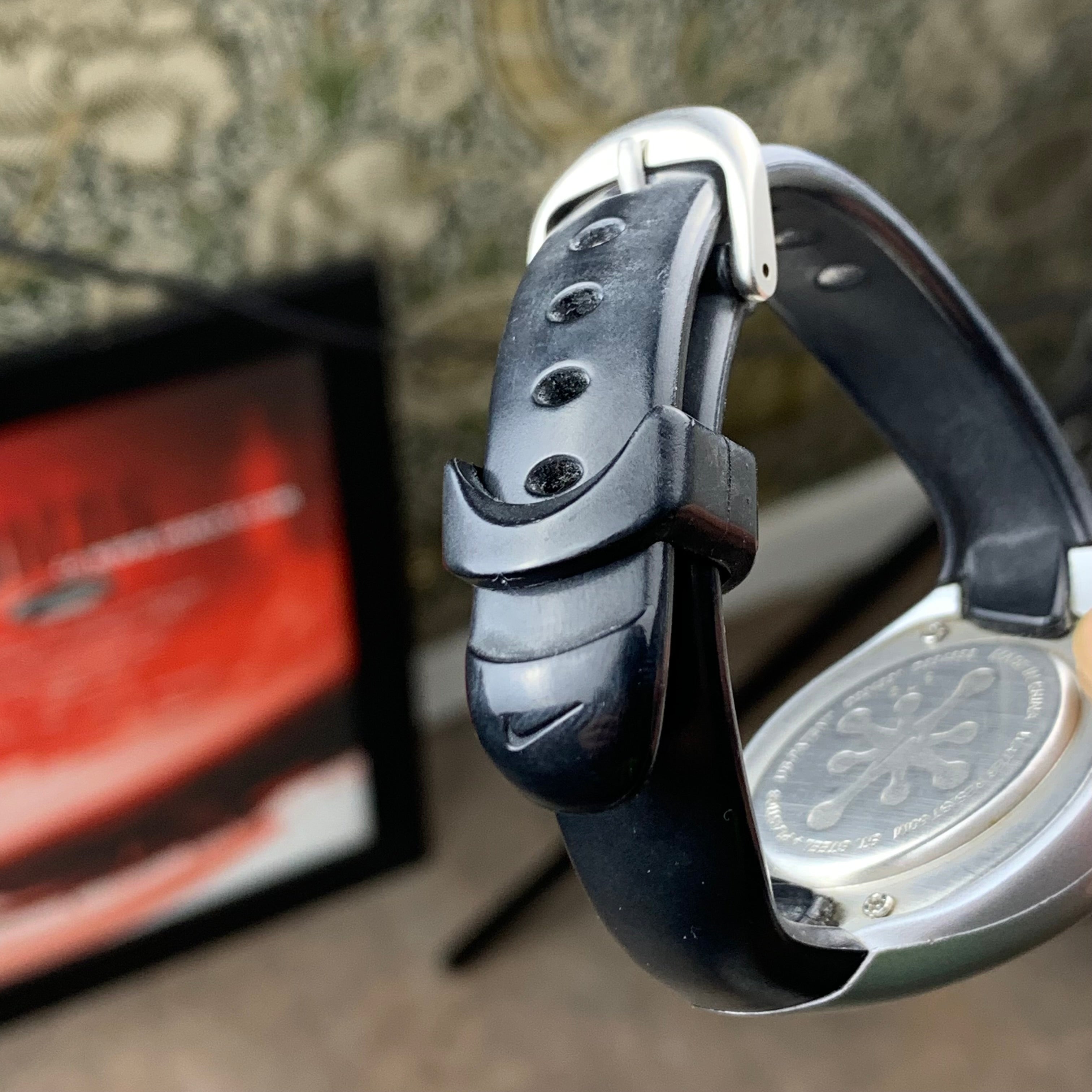 Rare vintage Nike watch with a graphic on the crystal, coloured black with a grey case and in excellent second hand condition with a new battery just put in, working fine and little to no wear.
