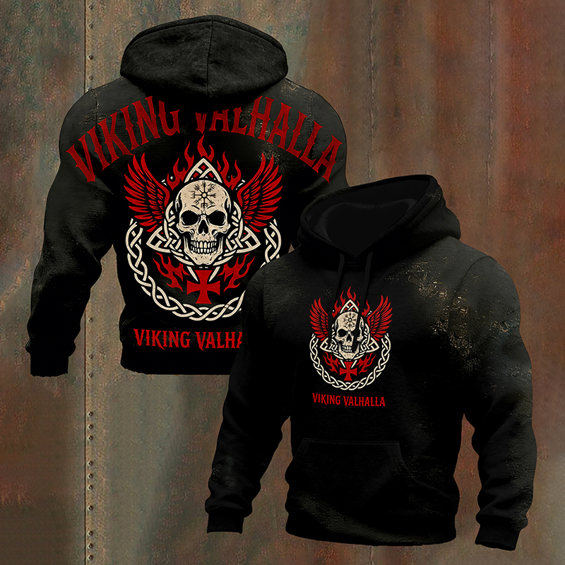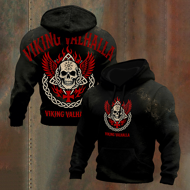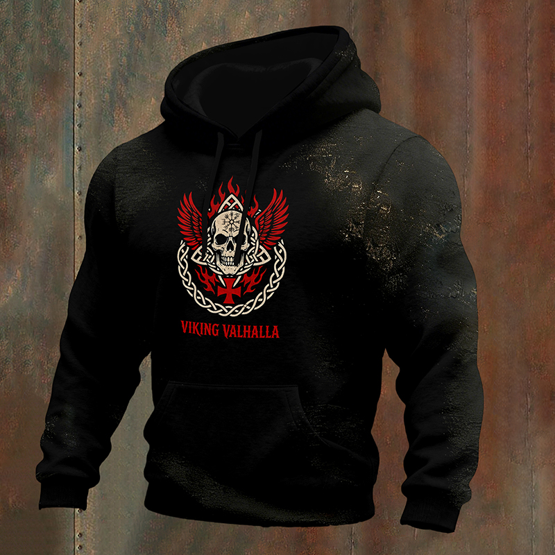 Simpfit Herren-Hoodie mit Wikinger-Walhalla-Motiv, Totenkopf-Runen und Flammenfl��geln (Grafikprint)